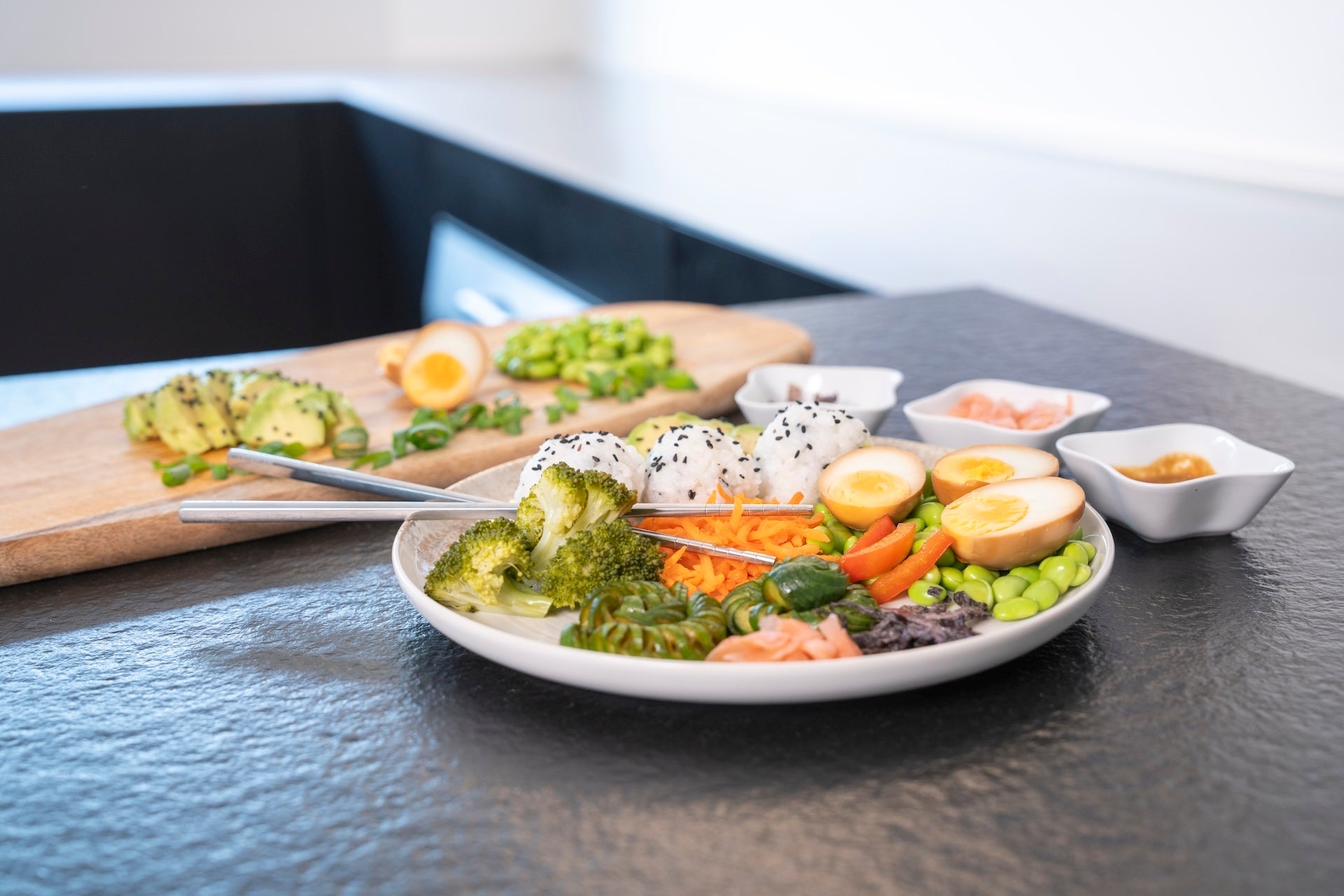 Proef de Mellow Umami Boost: een kleurrijke bowl vol frisse knapperige groenten, romige avocado, edamame en zachte sushi-rijst balletjes. De gemarineerde miso-eieren zorgen voor een rijke, umami-boost, terwijl crunchy toppings als sesam en nori het geheel afmaken. Een gebalanceerde, voedzame maaltijd met alle smaken van sushi – maar dan in een verrassend nieuw kleedje.